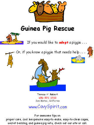 Also, this is not just a giant graphic. We have created the page so that if you want to create your own rescue poster, you can look at the html or download and use some of the graphics. If used on your website, PLEASE give credit to the Muze Arts guys and add a link to www.CavyRescue.com. That's all we ask. These can go ANYWHERE! But here are some suggestions: Vets, animal hospitals, other rescue places, even Humane Societies, SPCAs, pet stores, any animal related place or service, schools, preschools, daycares, community areas, at work, grocery stores, drug stores, just about anywhere!