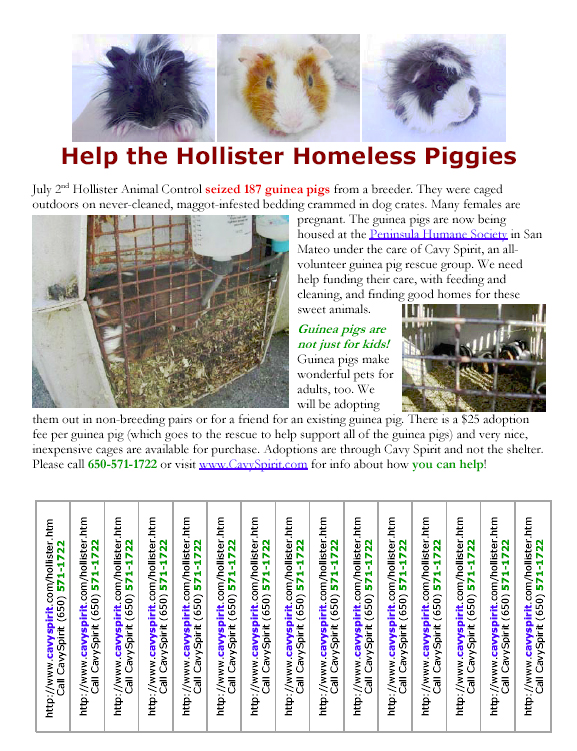 ALL guinea pigs are located at the Peninsula Humane Society (PHS) in San Mateo, California or in private foster homes and all adoptions are being managed by Cavy Spirit. They are not in the normal public area. PHS DOES have some guinea pigs for adoption. PHS is located just off the Peninsula/Poplar exits on 101 in San Mateo (half-way between San Francisco and San Jose). For HOW-TO-HELP, including adoptions and donations, please see the info below the Updates.