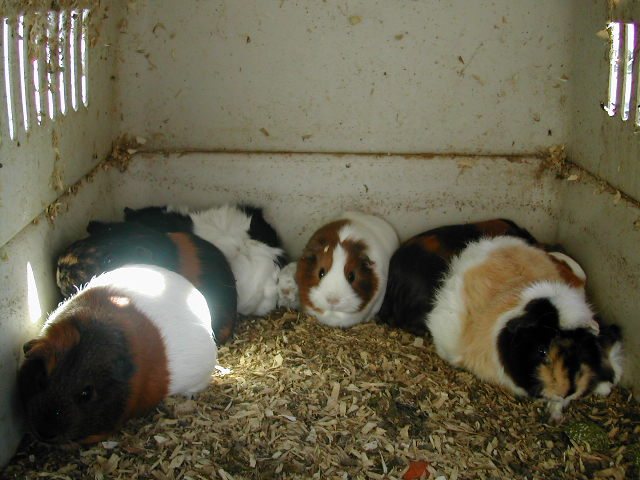7/10/02: The 70 not only survived the first night in their new abode, they were popping and snoozing and very happy. So happy some of them have started bickering! Even though they have more space and a huge increase in the quality of environment, we still have limited space available. We really need to get them adopted out now. The woman has now officially surrendered them! They are ADOPTABLE! Let's get them adopted! We will continue to create more cage space on Thursday and Friday. We have arranged to transport the remaining guinea pigs by Friday evening. PLEASE see the section below on how you can help out. We really need lots of help!