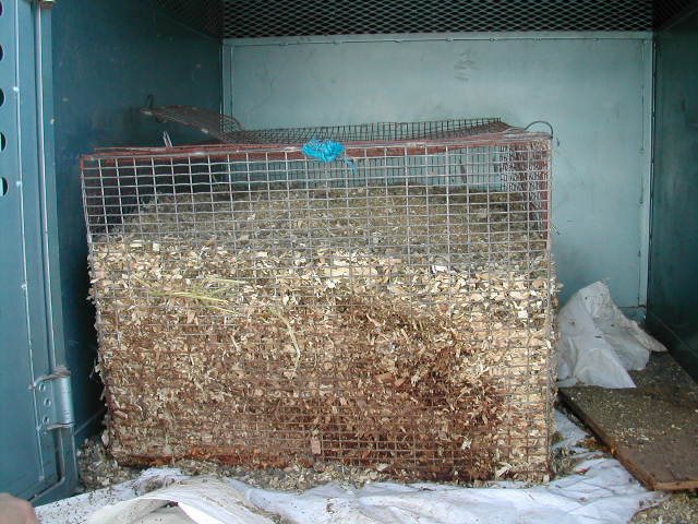 As you can see in the photo album, the technique used for cleaning cages was to throw new shavings on top of old shavings -- for a long time. In one cage, the pile of feces was so high, the hair on the backs of the pigs was poking through the rusted cage wire on the top of the cage as they walked along. The pigs were supposedly fed rabbit pellets and vitamin C in the water.