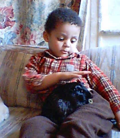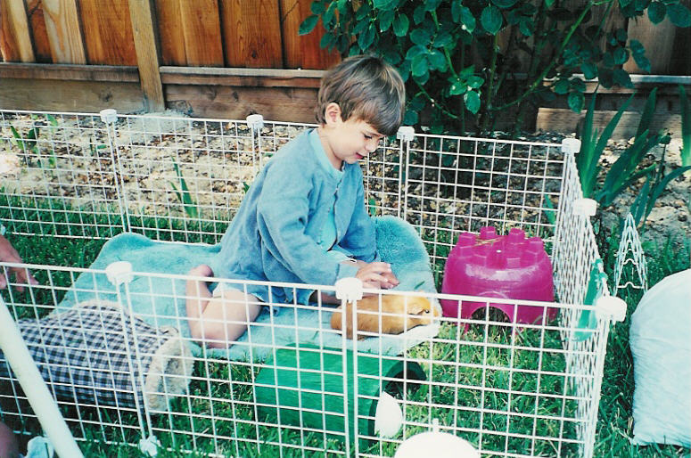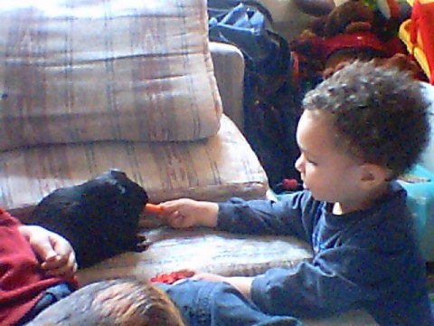 from salana | I have a 4-year-old and a 2-year-old. My four old son, Toby is allowed to hold one piggie at a time in his lap and feed them veggies. Toby's really good with the piggies, the cat, and the fish. Toby even lets Rayna climb up on his chest for a kiss while he's sitting on the couch.