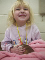 from Joanna | I started my niece and nephew off with guided petting, where I held their hands and controlled how they were petting the pigs. "Pet him softly . . . let's stay away from his eyes . . . " etc. Then they moved on to petting with supervision, learning more about the pigs, "What color is Einstein's nose?" "PINK!" My niece has held pigs in her lap with me sitting right beside her and is at the point where she can hold some of the pigs (mainly Cuddles and Doom) in her lap on her own. Cuddles is quite fond of her and Doom is pretty easy to manage as long as he's getting attention and being talked to. I don't let her hold Suzi, who is high-strung and somewhat bitey, or Jackie, who is terrified of everything, yet.