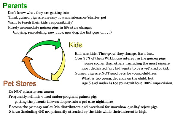 Even with very stringent adoption criteria and low return rates (people bringing back the guinea pigs they've adopted), rescues experience about a 10 to 1 ratio of returns from families with children as compared to adults-only households. The ratio of actual surrenders, phone calls from people wanting to surrender and ads placed for 'rehoming' is closer to 100 to 1 from families with kids as compared to adults-only households. The problems compound with the parent's attitude of "it's only a guinea pig" combined with the kid's attitude of "I want a guinea pig (read 'new toy')." This recipe creates one highly disposable animal exacerbated by the pet stores that use the guinea pig as a loss leader (cages usually at child's eye level) to encourage the purchase of the cute, little, fuzzy, moving toy so that the parents will become loyal customers of the profit-generating supplies.