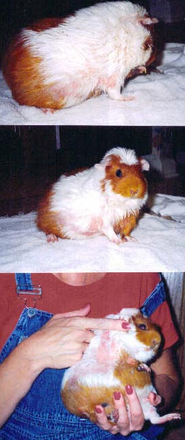We noticed that he was a male, yet he had been put in with all the females. We would later find out why...Over the next few days, at home, we began to notice that something was wrong with Brownie: he shook like a little old person as he walked, and leaned his little head to the right pronouncedly. He also 'vibrated' sometimes - which Petco employees told us (when we phoned that night) was 'normal' for piggies - and that it meant they were 'happy'. Brownie felt warm to the touch. We spent the night on the floor next to his cage to watch him closely. He was not really eating a lot or drinking much either.