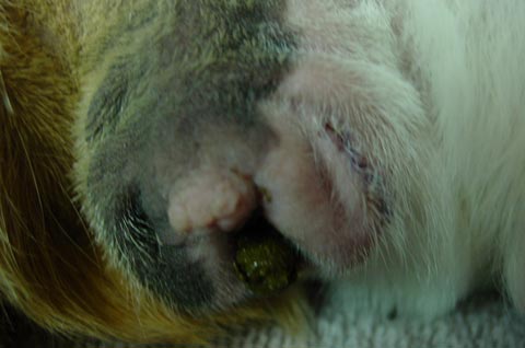 |  | Some males have an active scent gland (just about the tail area) with a noticeable waxy or greasy buildup. Neutering seems to reduce the waxy scent gland buildup.