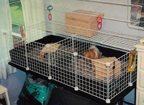 What if you need to separate your guinea pigs at any time because they stop getting along? You'll need to make sure that you can provide them both adequate cage space with a common grid wall so that they can be next to each other for company and safe interaction. Ideally, that means a pretty large cage -- a 2x6 grid cage ( which requires a 7.5 or 8 foot long table). That cage allows a common grid wall divider down the middle to provide the minimum cage space of 2x3 grids (or 7.5 square feet) per guinea pig. That can be a tall order for many people (15 square feet of cage space). In those circumstances, many people will compromise on cage space (such as the one pictured to the right) and some will try to compensate with additional floor time. A split 2x4 grid cage (photo right) will provide each guinea pig with 5 1/4 square feet of space. That does not meet our minimum but is still almost 2 sq feet larger than the typical "large" SuperPet cage.