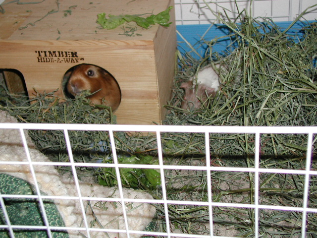 |   Barney & Muffin went to piggie condo paradise. Their new digs will be featured shortly on Guinea Pig Cages. Oh yes, this is going to be one spoiled pair of cavies! (9/21/01) Update on (12/30/01) Barney and Muffin are doing just superbly. They are healthy and happy and have complete command of the best cavy slaves possible! | |