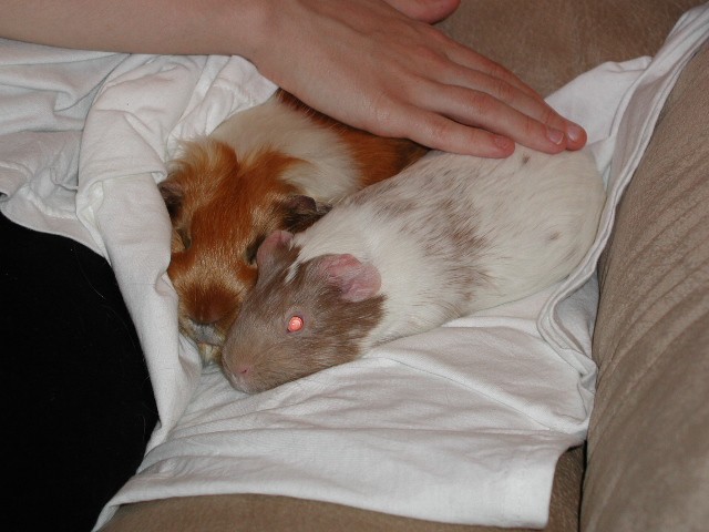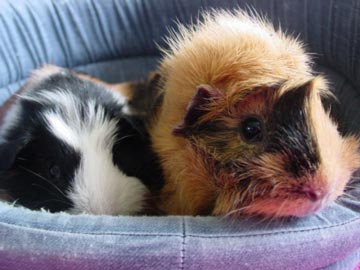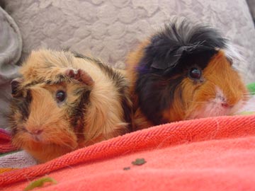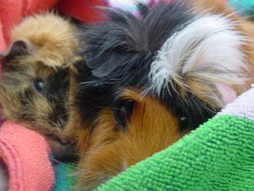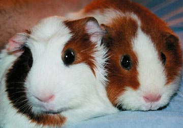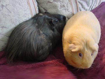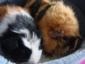 |   Babbs and Binky, are very sweet and cuddly girl went with Binky to an nice new forever home this weekend (now Marigold and Miami). (11/03/01) (11/23/01) Just wanted to let you know that they're doing great. Last week Miami took a treat out of my hand for the first time! And now he'll eat while I'm holding him too.  He's still pretty shy compared to Marigold but I've noticed that he's starting to warm up to people. Sometimes he doesn't want to come out of his pigloo to eat so he'll push the pigloo around so the entrance is near the food and eat from inside. Marigold is a good role model; she tries to show him that it's okay to come out of the pigloo and be friendly. They're both very happy. | |