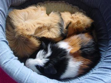 They get along famously during the day -- walking side by side, eating competitively, and staying close. The problem seems to be that Munchkin wants to share the same plywood house at night (they have 2 houses) and she lays as close to Punky as she can possibly get (over, under, and side-by-side). It's actually funny to watch -- like watching a pair of rabbits collapse in a pile rather than a couple of guinea pigs. Needless to say, Punky protests loudly for a minute before she accepts the arrangement.